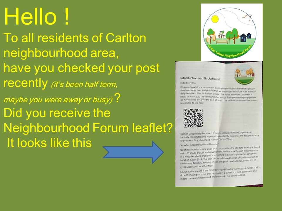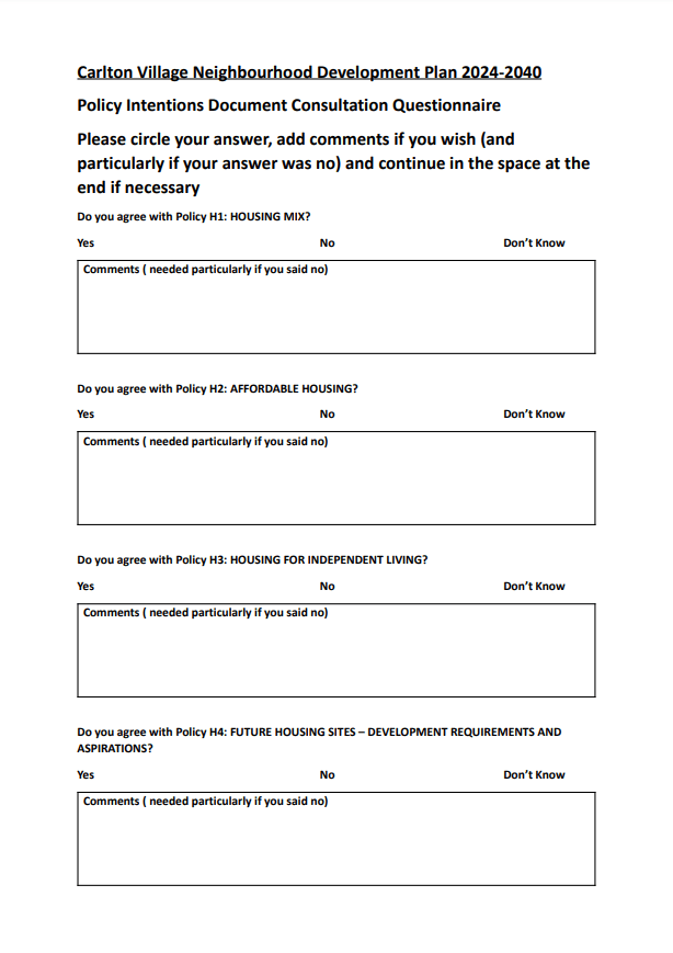 The Carlton Village Neighbourhood Forum (CVNF) is in the process of creating a Neighbourhood Plan which will guide and influence any further development in the designated Carlton Neighbourhood Area.